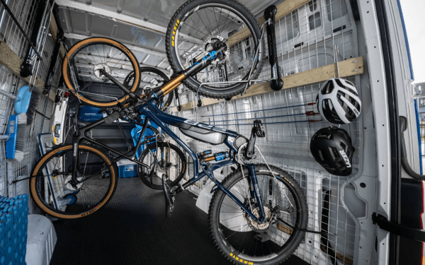 - Economise l’espace au maximum (l’encombrement d’un VTT passe de 105 cm à 65 cm, un vélo route de 110 cm à 52 cm)